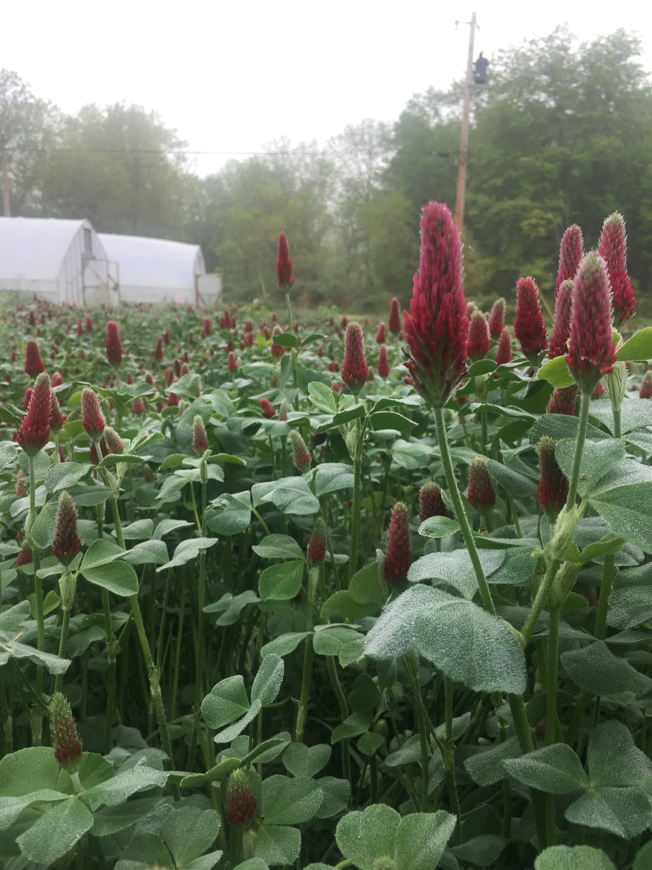In the moments that we’re not fretting over flowers, we’ve been thinking a lot about cover crops! It’s time to mow down some of our overwintered cover crops, and we’re preparimg to seed some buckwheat in other places. Right now, our crimson clover cover crop is in bloom, and above ground, the beautiful sea of red flowers is attracting pollinators, while below ground, it’s working as a nitrogen fixer, which means that it is converting nitrogen in the atmosphere to nitrogen that is available for plants to use. When we mow the clover and other cover crops in the field, we’re provided with a good source of of organic matter that will break down in the fields.