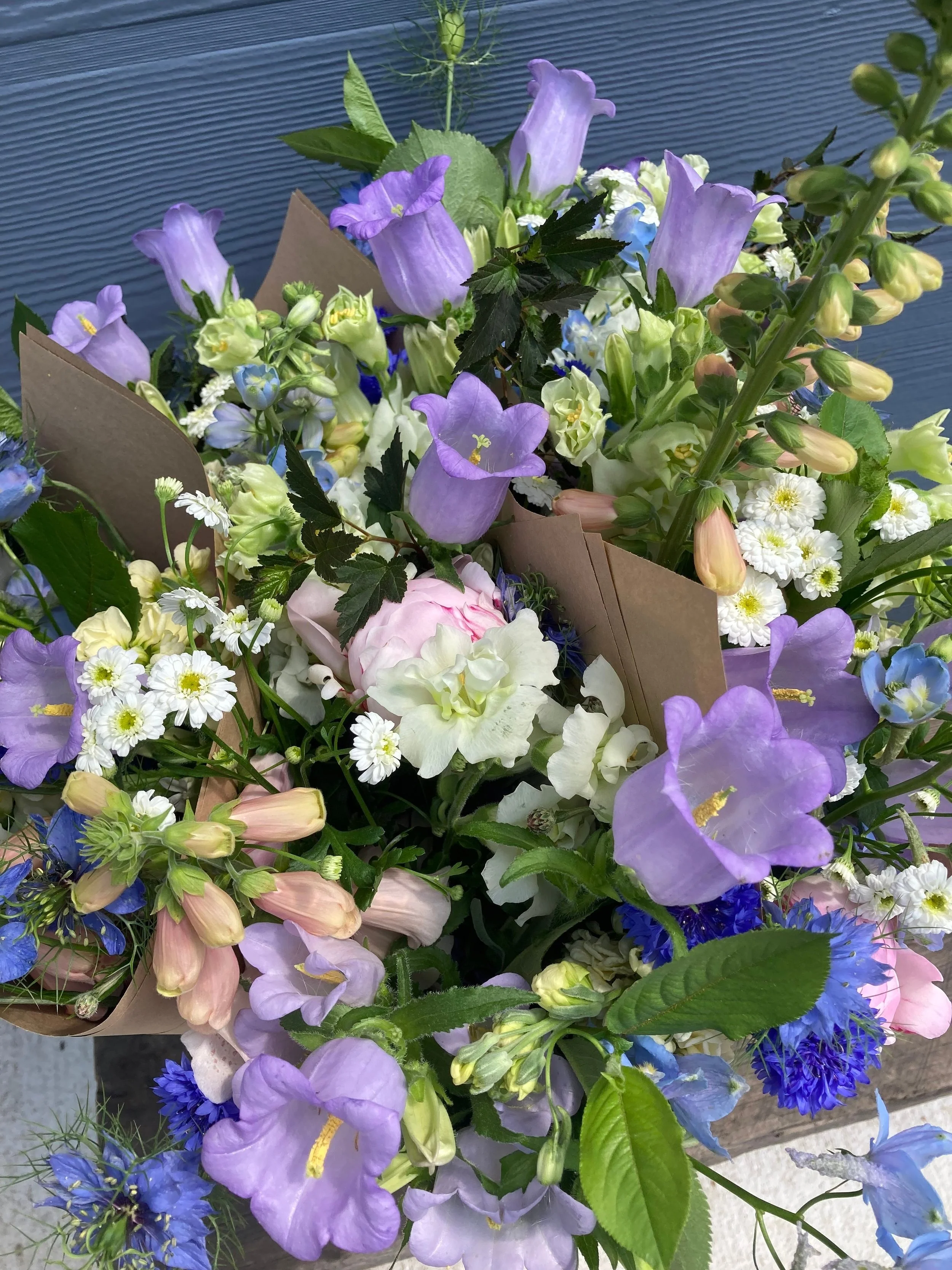 This week’s bouquets feature foxglove, campanula, and delphinium.