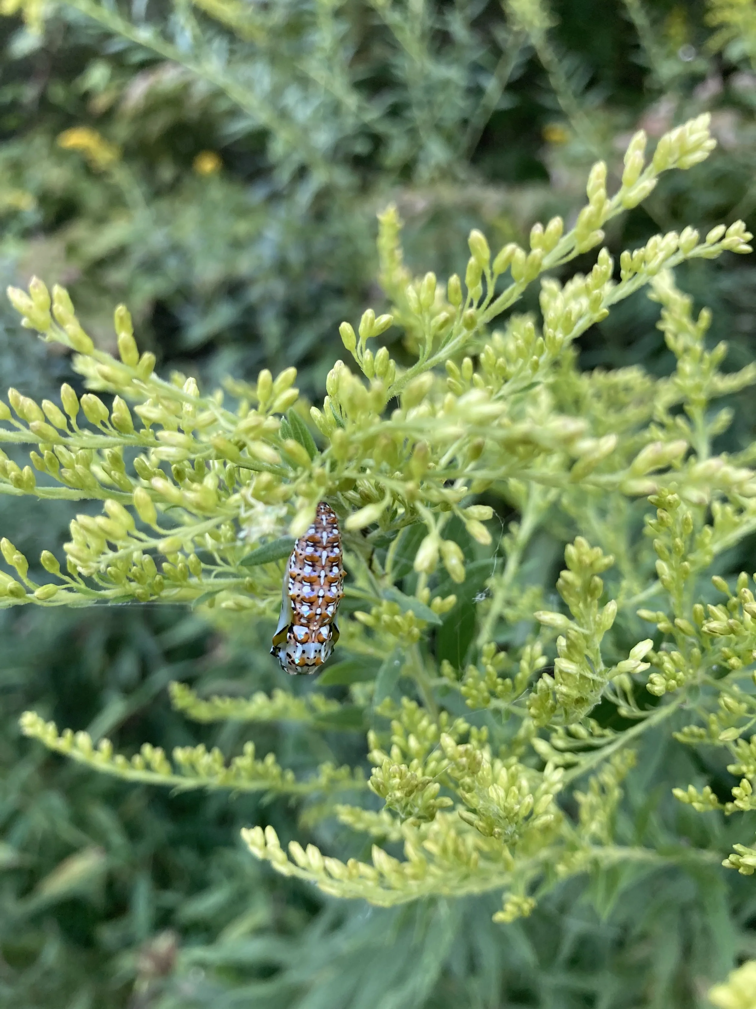 A variegated fritillary chrysalis, hanging from goldenrod.