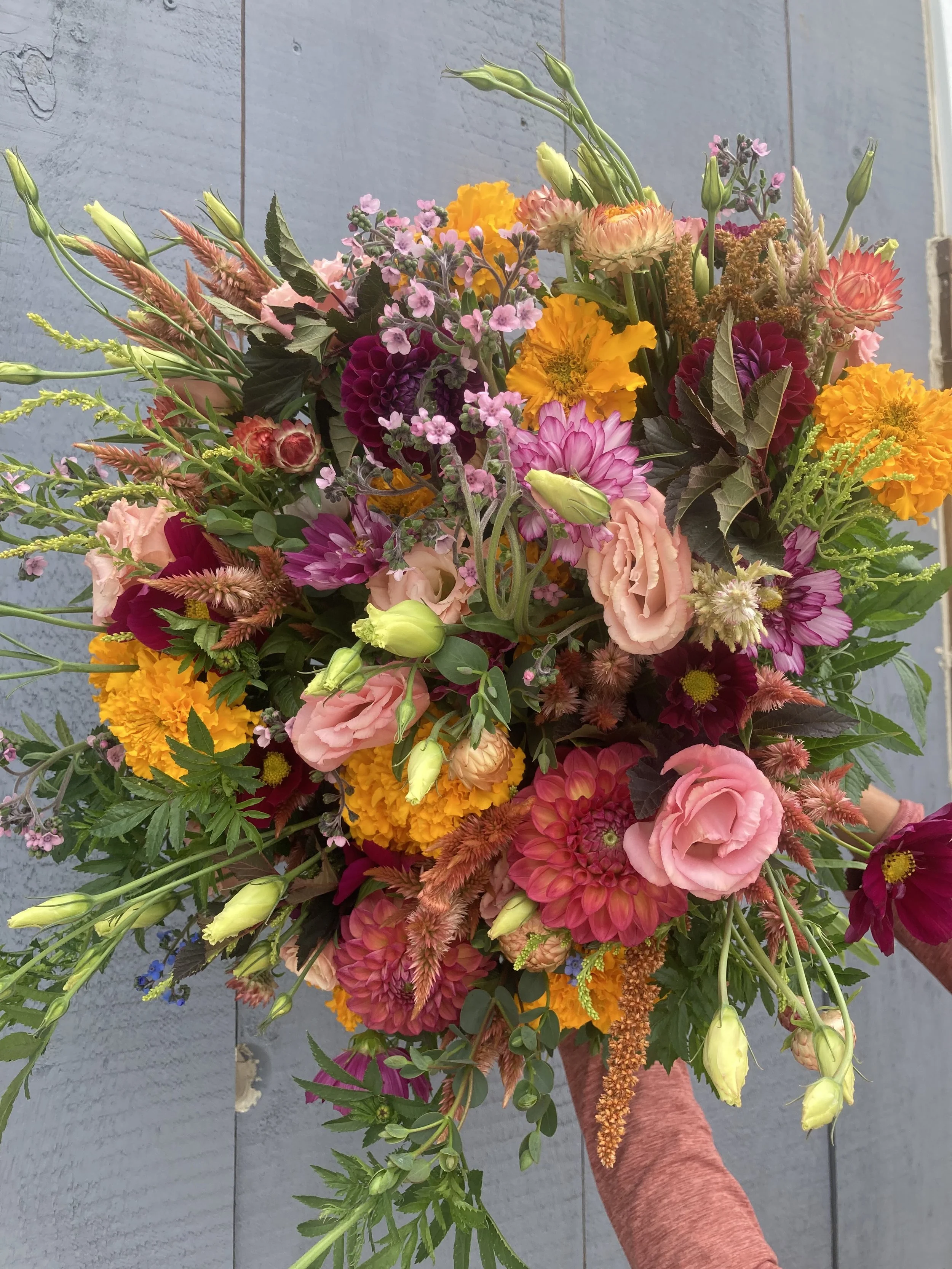 Lovely bouquets full of marigolds and lisianthus will be available at market this week.