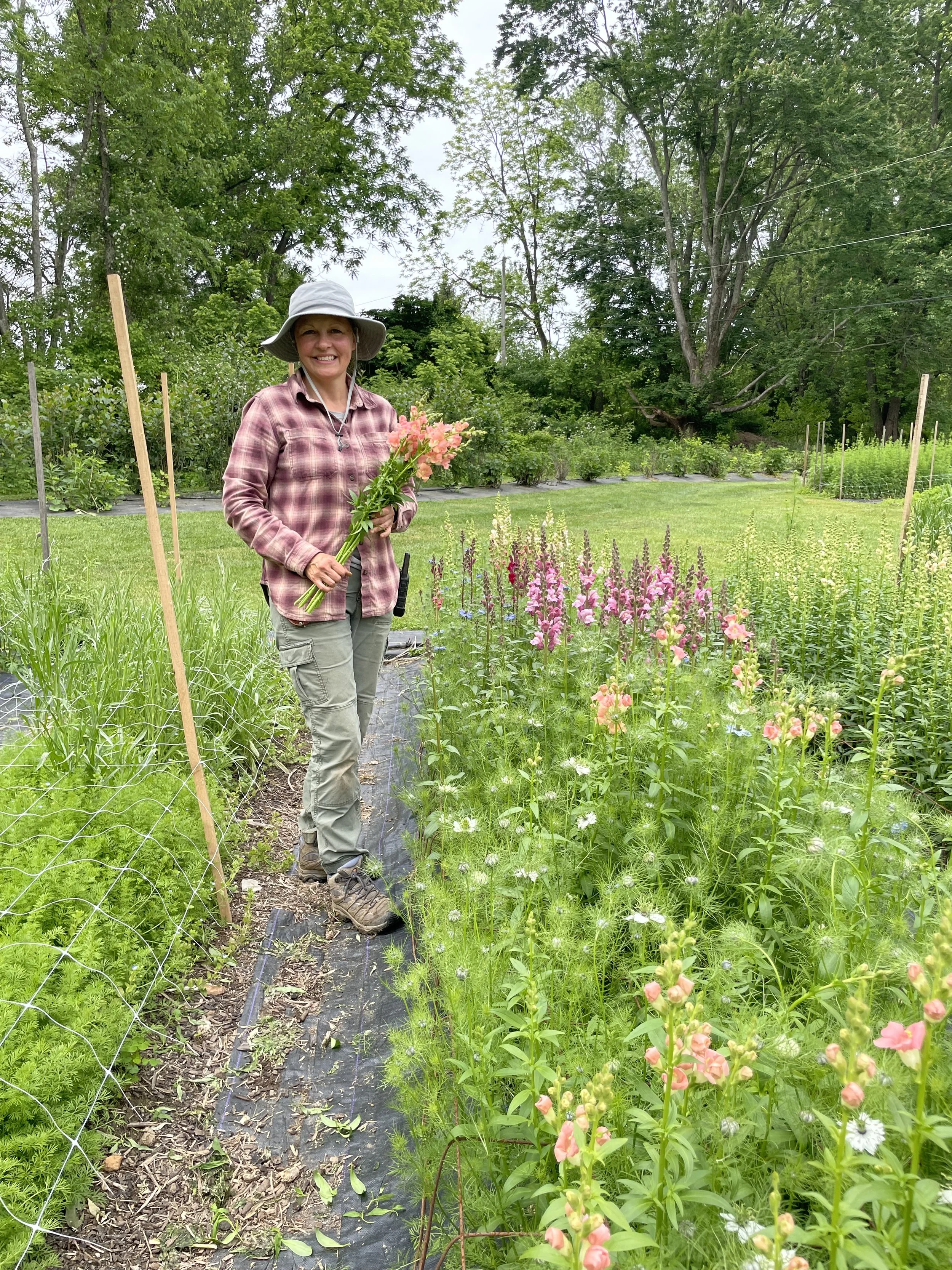 Karen standing next to our crew’s current favorite bed on the farm. We planted a bed of half mixed snapdragons and half dianthus, and then a lot of nigella volunteered. It ended up being a magical microcosm of color and texture.