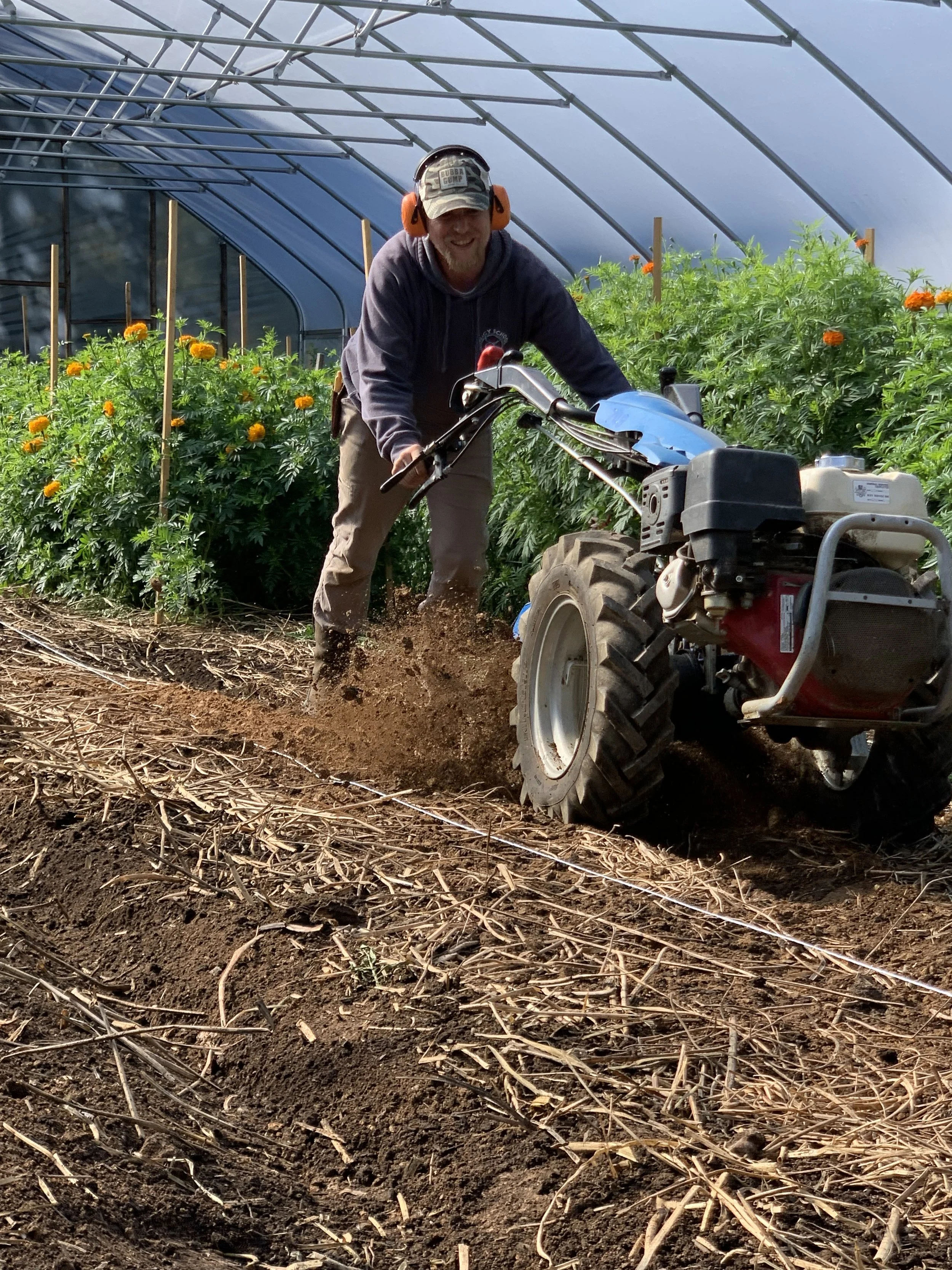 Dave, using a rotary plow to re-shape the beds in our high tunnels. Over the years the beds settle and become one with the pathways, so we plow or shovel new paths to define the space.