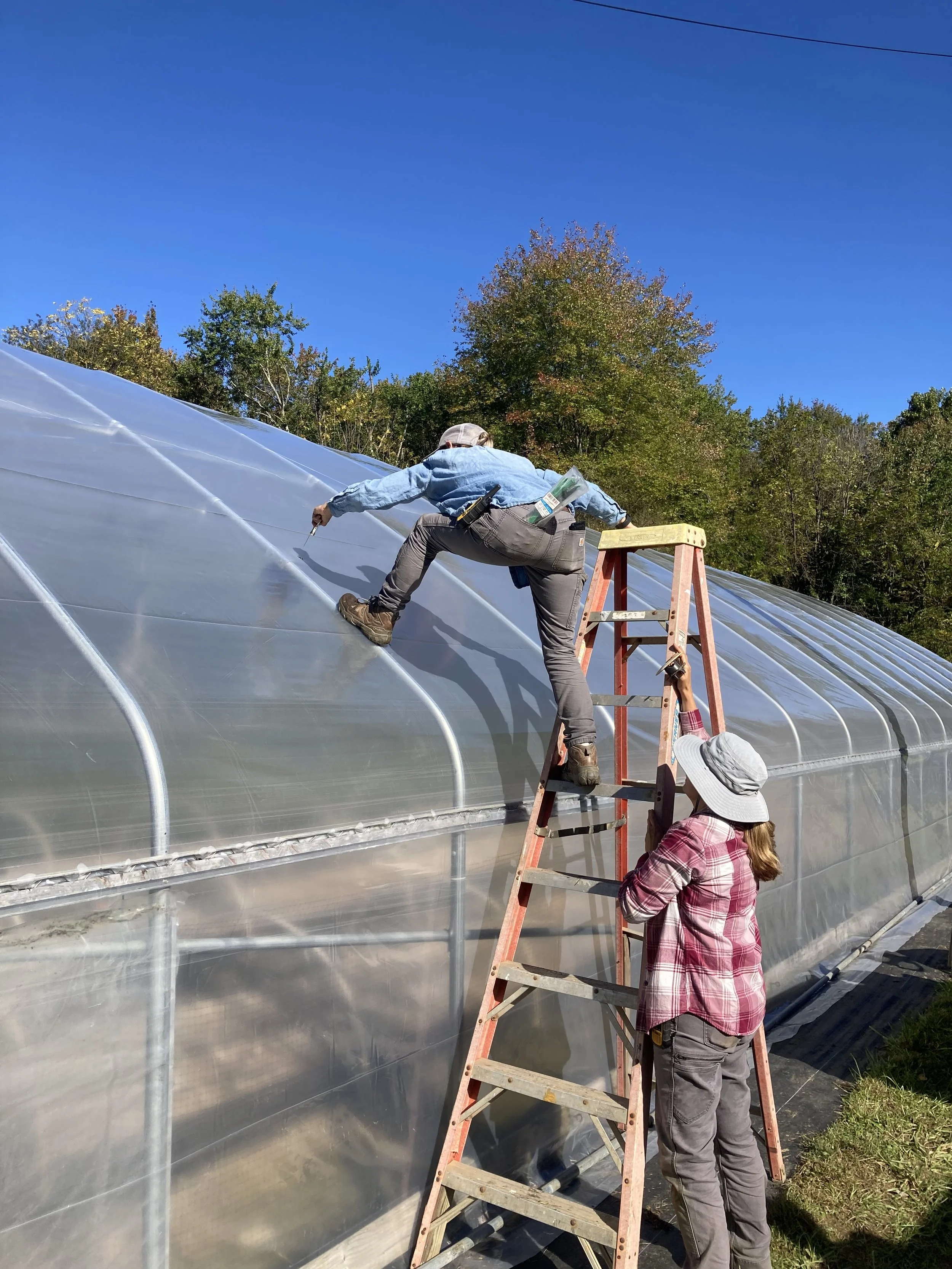 On Tuesday this week we knocked out one of my favorite farm projects- reskinning the greenhouse! Reskinning is simply the act of replacing the weathered plastic on a greenhouse or high tunnel. I used to hate reskinning tunnels, it always felt chaotic, stressful, and full of the possibility of tragic errors. Fortunately, we have an excellent and experienced crew, and after years of working together, it’s the kind of project we’re able to complete with ease and even a few laughs. It was our first time reskinning the farm’s greenhouse, which is a little bit more complicated than skinning a tunnel, as it requires two layers of plastic and carefully cutting a hole for the greenhouse fan. Fortunately, the operation went off without a hitch, and the greenhouse is bright and beautiful.