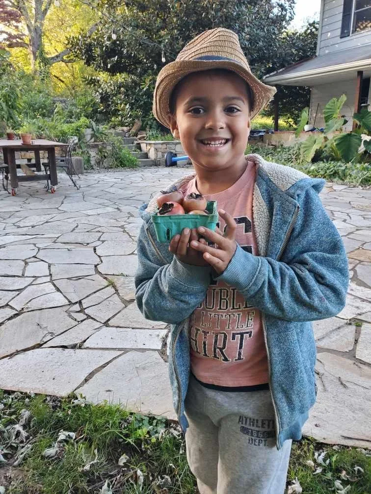 Finn, showing off some persimmons. They sold out quickly last week! We don’t have any this week, but we’ll have a different variety ready to harvest soon.