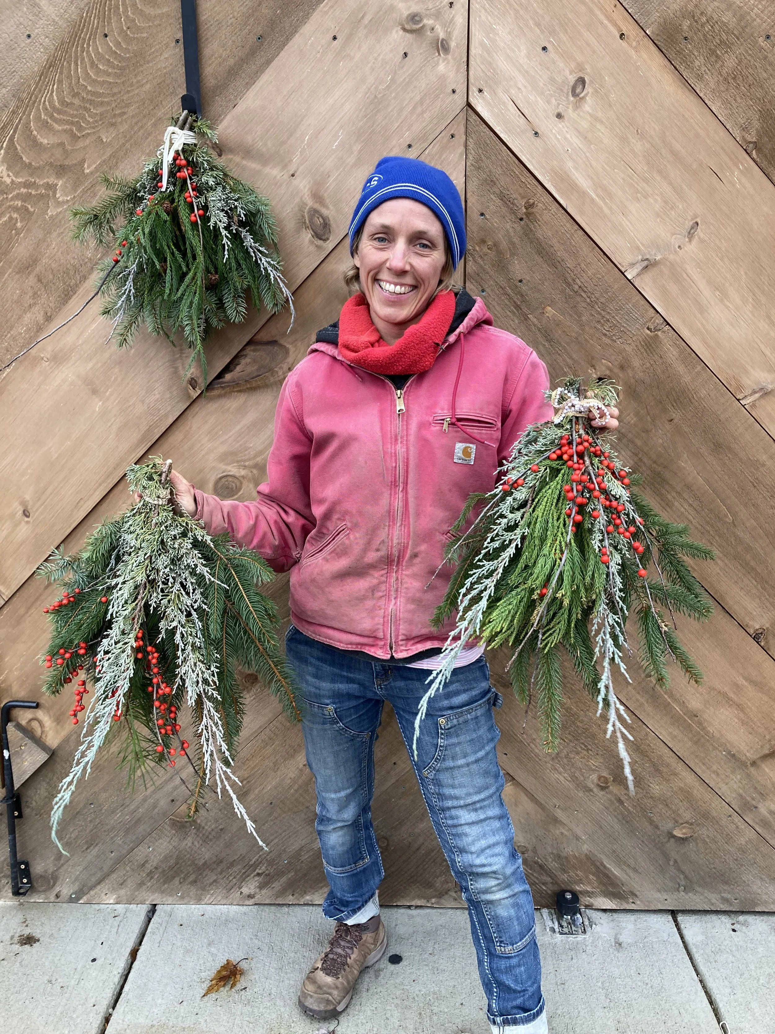 At these final markets of the year we’ll be selling wreaths, floral ornaments, evergreen swags, Two Boots hats and tote bags, Two Boots greeting cards, persimmons and a special selection of produce from our dear friends at Weaving Roots Farm. Weaving Roots will have salad mix, baby kale, cabbage, daikon radish, hakurei turnips, and chard. We look forward to seeing you soon!