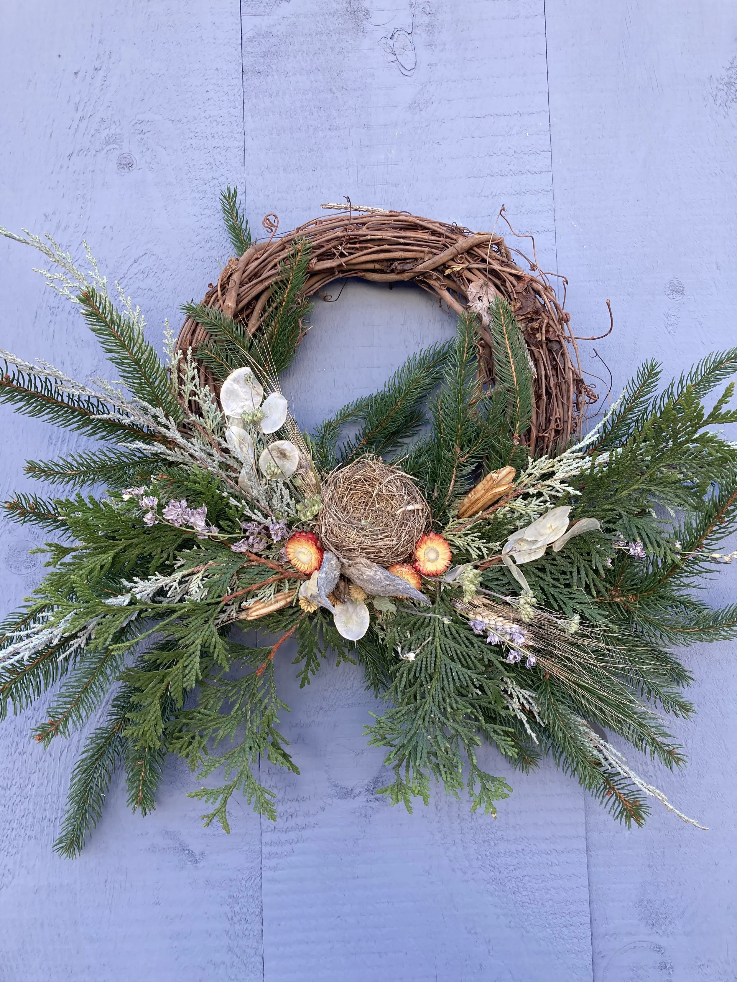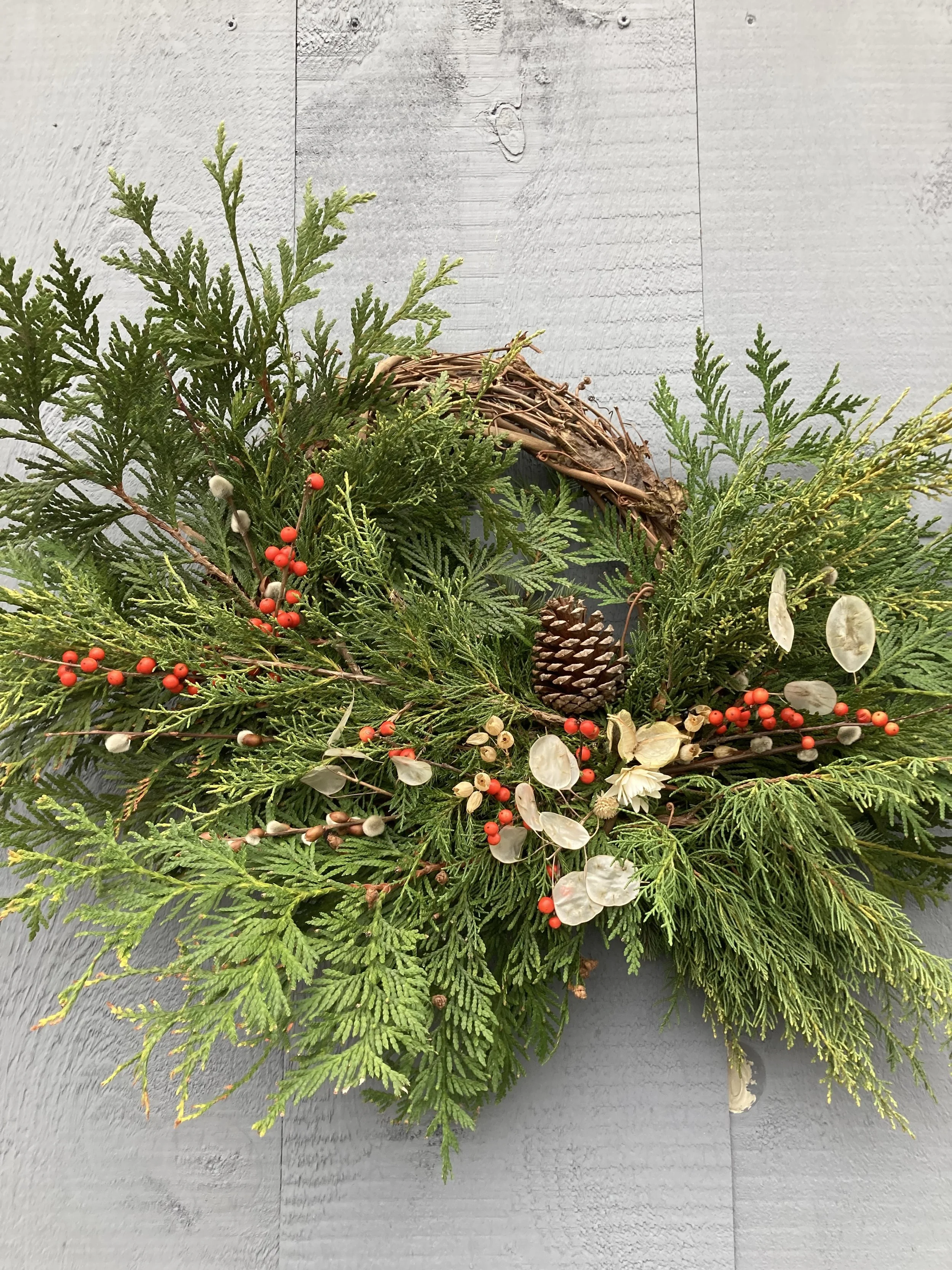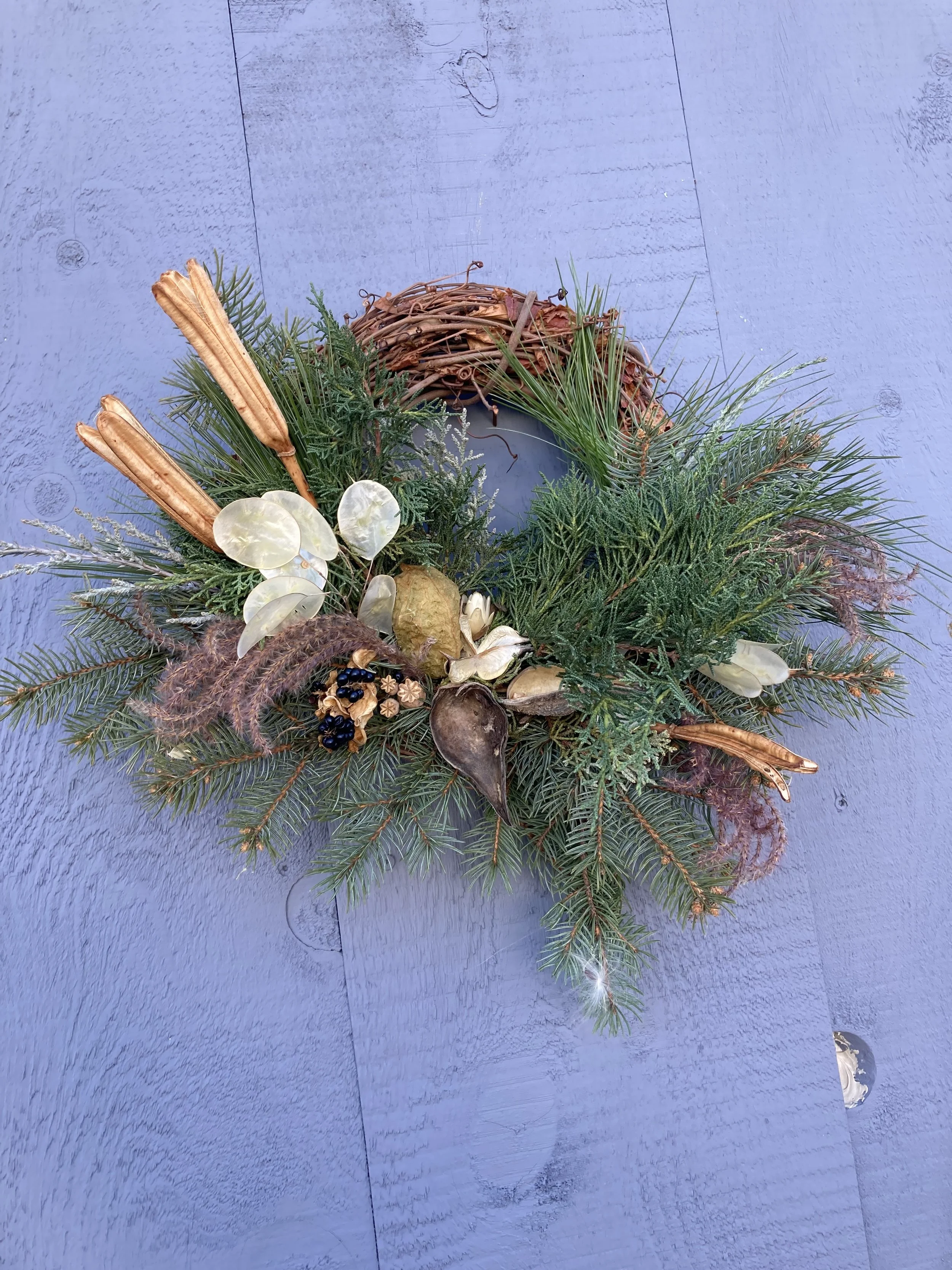 We’ve been making a ton of wreaths ourselves recently. This time of year I try to spend several hours a day focused solely on wreath making, and it’s a lovely way to pass the cold mornings. Every day I manage to find a new element to incorporate, and each wreath is lovely and unique. It’s a true pleasure to create these to share with our customers. The wreaths we’re making right now feature a grapevine base, evergreens, and an assortment of dried flowers, seedpods, and more. We’ve had customers tell us that they’ve successfully kept these wreaths hanging outside well into February!
