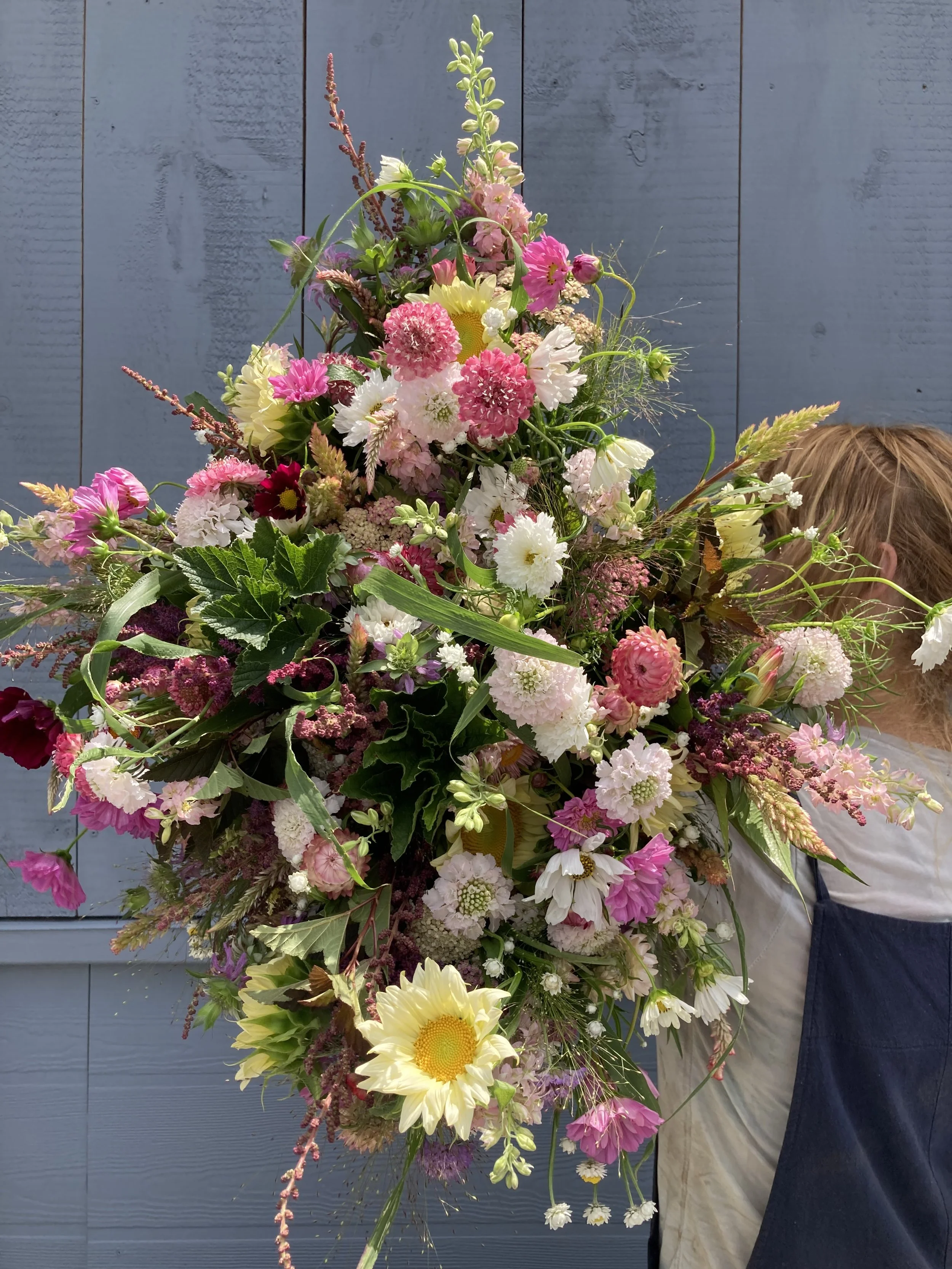 Just as our crops tend to struggle through the heat, so too do the farmers. Our strategies for dealing with it during the workday are multifaceted. We can usually be found wearing long sleeves and lightweight, breathable fabrics, and adorned with hats to keep the sun off our heads and shoulders. Sometimes I like to dunk my hat or a bandanna in water to cool my head and neck. We always start the day with out flower harvest, but as soon as the blooms make it to the cooler we try to prioritize the high exertion tasks for the more temperate time of day. Once the weather is really hot, we try to focus on less strenuous tasks, like pinching, hand weeding, and bouquet making. We always keep Pedialyte popsicles on hand, and we’ll mix up an electrolyte beverage with apple cider vinegar and sea salt from time to time as well. And of course, we drink a whole lot of water!